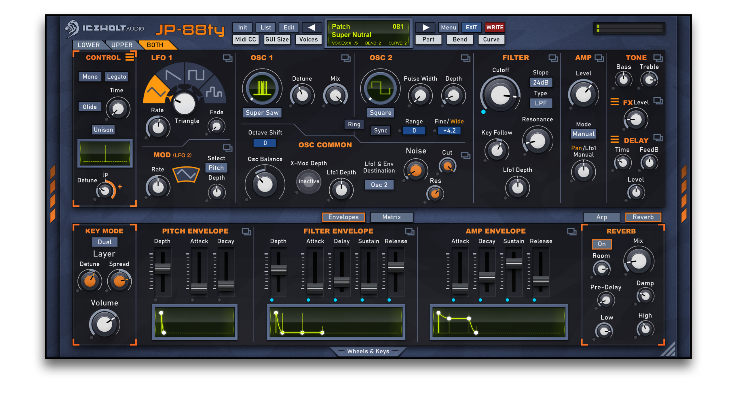 FILTER ENV / AMP ENV – These two Envelopes of the JP-88ty are modeled after the real Synth. They have the same behavior. Even the “clicky” attack sound occurs at Attack 0.